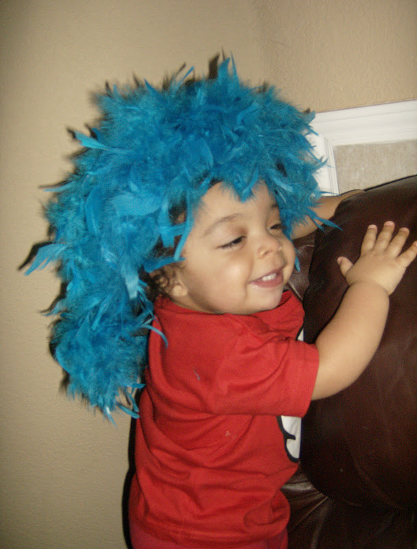 We celebrated Halloween this past weekend with a family party at my sister Jamie's. My mom decorated and everyone brought delicious food. We had our usual pumpkin decorating contest and my sister Jamie won with her rendition of Bert. I attempted Elmo and Cookie, but thing the large styrofoam eyes made them look very awkward. We dressed the twins up as Thing 1 and Thing 2 and Tim and I were Thing Dad and Thing Mom. Tim and I had a great time making everyones' wigs. Our kitchen looked like a blue chicken had been slaughtered when we were finished, but it sure was fun. I did not get one family picture the entire night, nor did I get one of the twins together in full costume. I dressed them up again last night after dinner and got a few more pictures, but Brooklyn would not sit still on the couch. As soon as I got them in position and backed up to take the picture she would be in the floor again. I never dreamed it would be this impossible to get pictures of toddlers. We didn't Trick-or-Treat this year because they are still so young, but next year we will for sure.